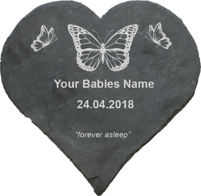 The slate heart comes with three butterflies, your babies name and date of birth. A special message of "forever asleep" is also engraved on the heart. The only information that we need is your babies name and date of birth, we will deliver the heart back to the hospital so that they can contact you to collect this memory.
